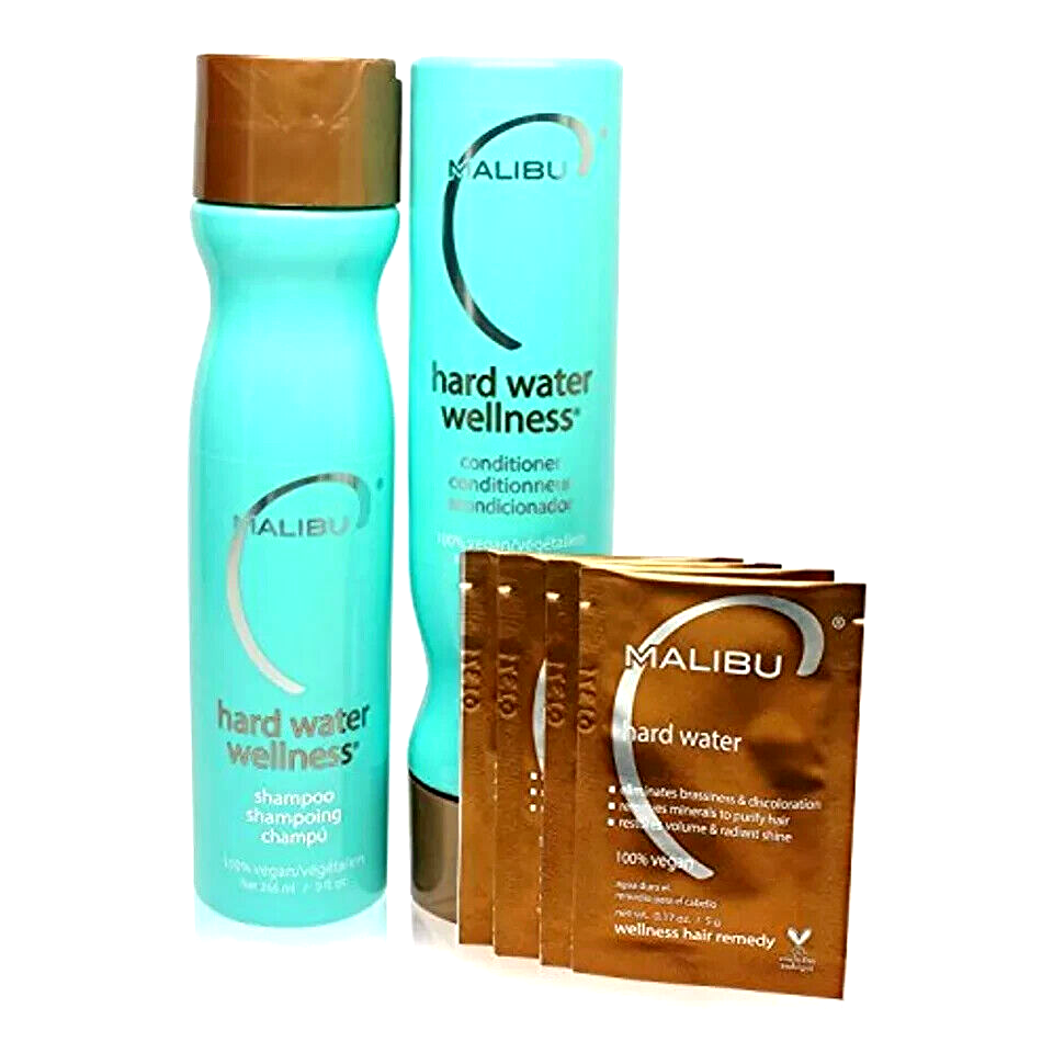 MALIBU C HARD WATER Wellness Kit 100% Vegan ~ 9 oz Shamp / Cond / +4 Remedy pkts